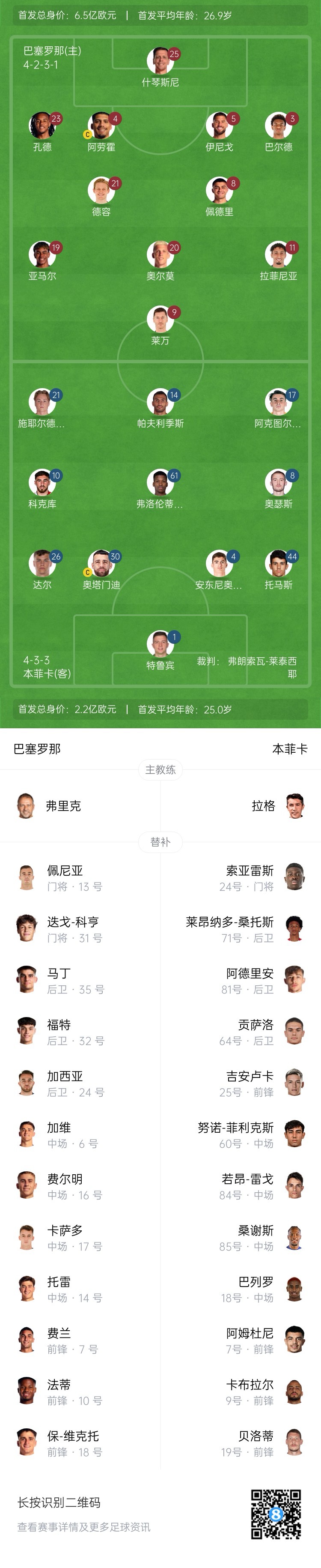 巴薩替補:13-佩尼亞、31-科亨、6-加維、7-費蘭-托雷斯、10-法蒂、14-托雷、16-費爾明、17-卡薩多、18-保-維克托、24-埃里克-加西亞、32-福特、35-杰拉德-馬丁