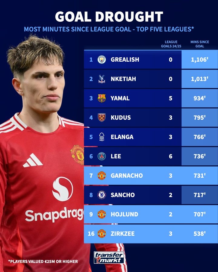 2025-02-26 08:05:27五大聯賽進球荒時間排名:格拉利什1106分鐘居首 亞馬爾934分鐘