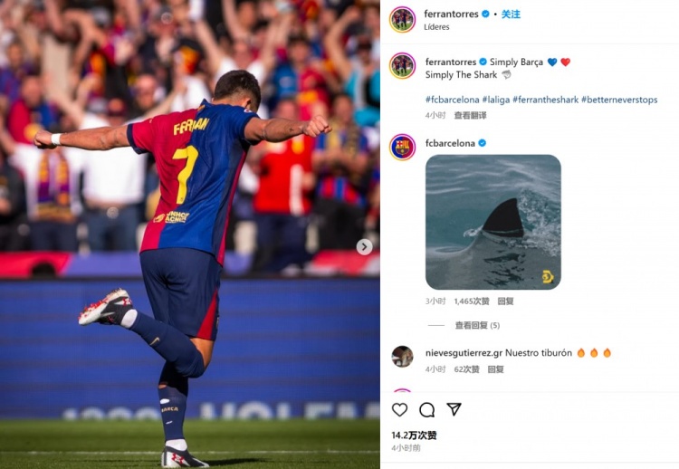 2025-03-31 09:57:28進球停不下來!費蘭-托雷斯社媒曬慶祝照:依然巴薩!依然鯊魚!