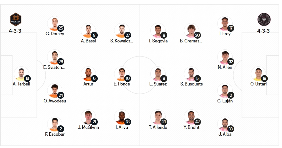 邁阿密國際首發:19-烏斯塔里、17-伊恩-弗雷、32-阿倫、2-盧揚、18-阿爾巴、5-布斯克茨、30-克雷馬斯基、42-楊尼克-布萊特、8-特拉斯科、21-阿連德、9-蘇亞雷斯
