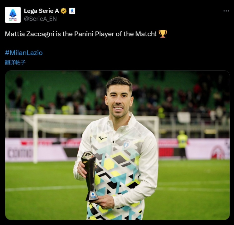 2025-03-03 08:38:27首開記錄!意甲官方:扎卡尼當選米蘭vs拉齊奧全場最佳球員
