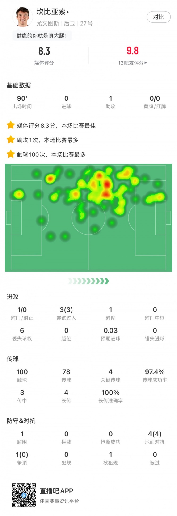 2025-03-04 08:55:03坎比亞索本場數據:1次助攻,4次關鍵傳球,3次成功過人