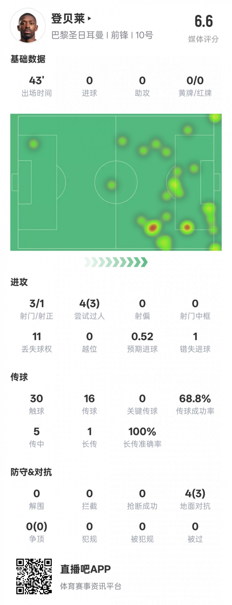 2025-03-06 10:24:42登貝萊半場數據:3過人成功11次丟失球權&錯失1進球機會,評分6.6