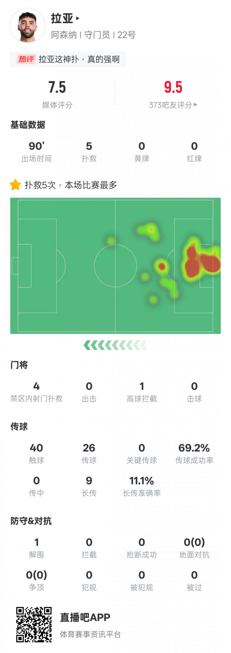 2025-03-10 05:59:03拉亞本場(chǎng)數(shù)據(jù):5次撲救全場(chǎng)最多&4次撲救對(duì)手禁區(qū)內(nèi)射門,評(píng)分7.5