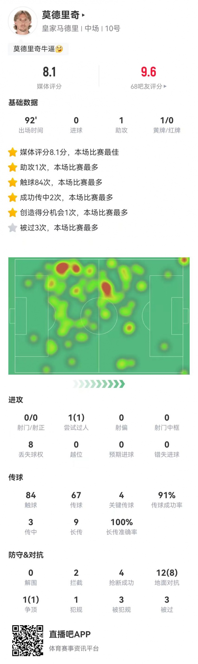 2025-03-10 05:59:59莫德里奇本場1助攻4關鍵傳球 10長傳9成功 13對抗9成功 8.1分最高
